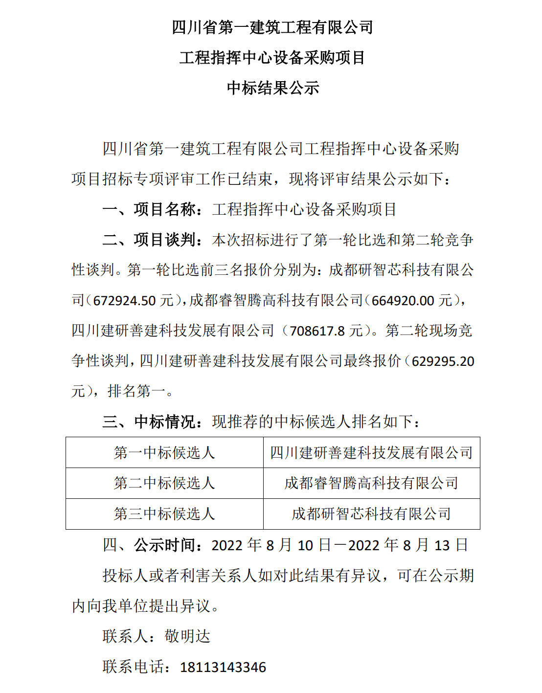 四川西南聯建建設工程有限公司 工程指揮中心設備采購項目 中标結果公示