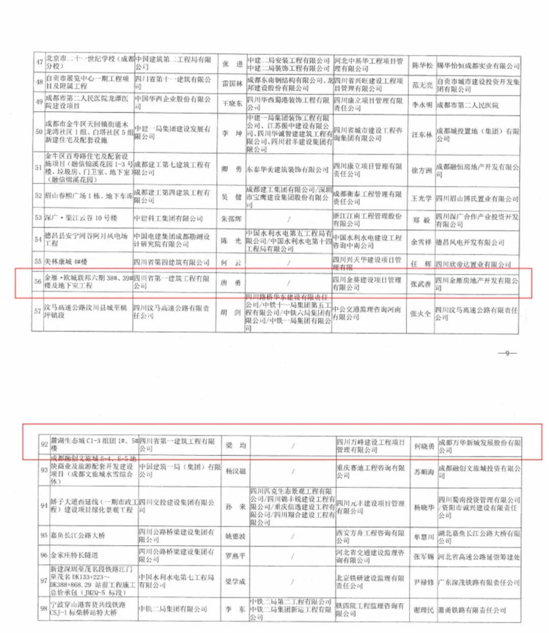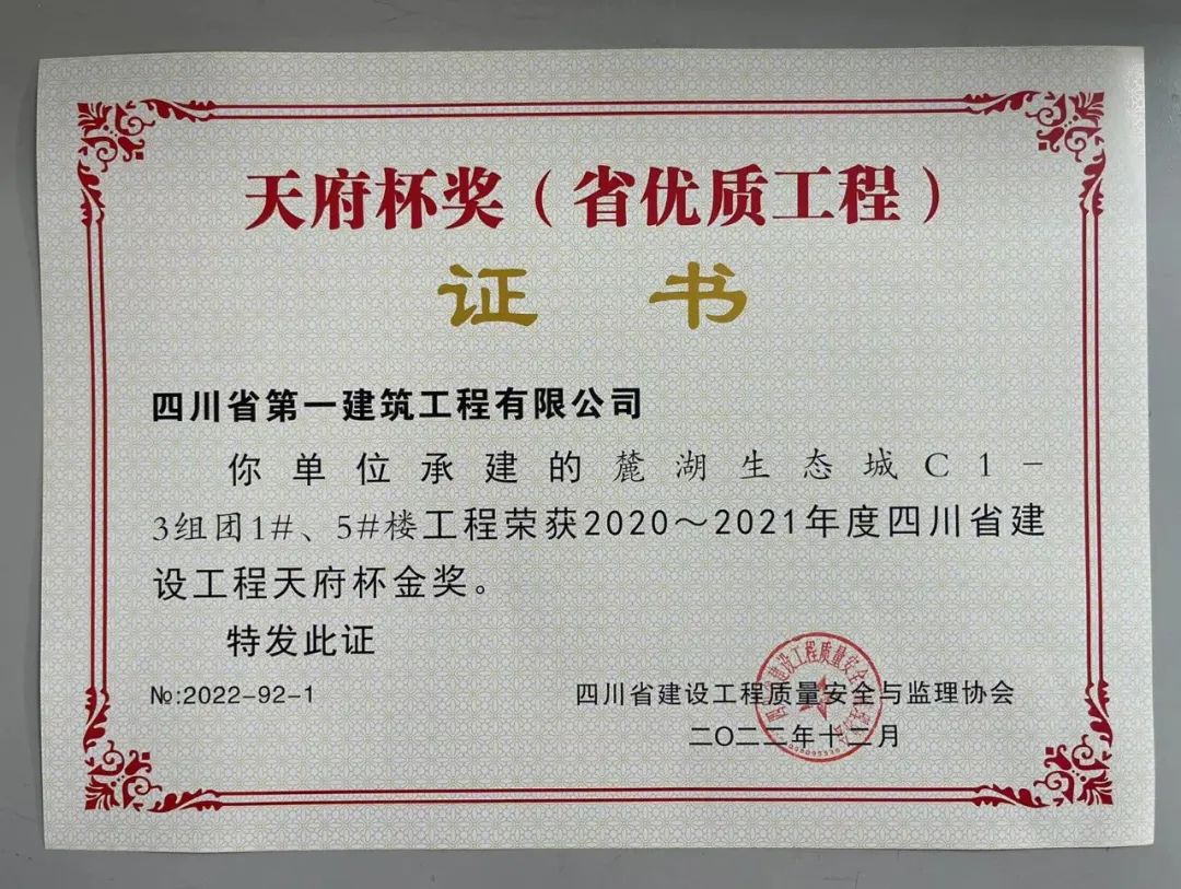 近日,公司承建的5個(gè)項目喜獲四川省建設工程質量最高(gāo)榮譽獎——四川省建設工程天府杯獎(省優質工程)證書(shū)。其中,麓湖(hú)生(shēng)态城C1-3組團1#、5#樓項目,金雁·歐城聯邦六期38#、39#樓及地下室項目獲天府杯金獎!