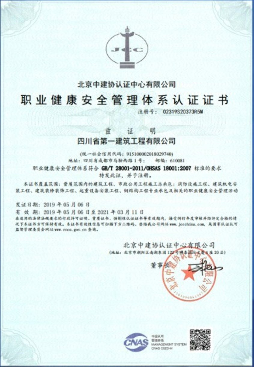 職業健康安全管理(lǐ)體(tǐ)系認證證書(shū)