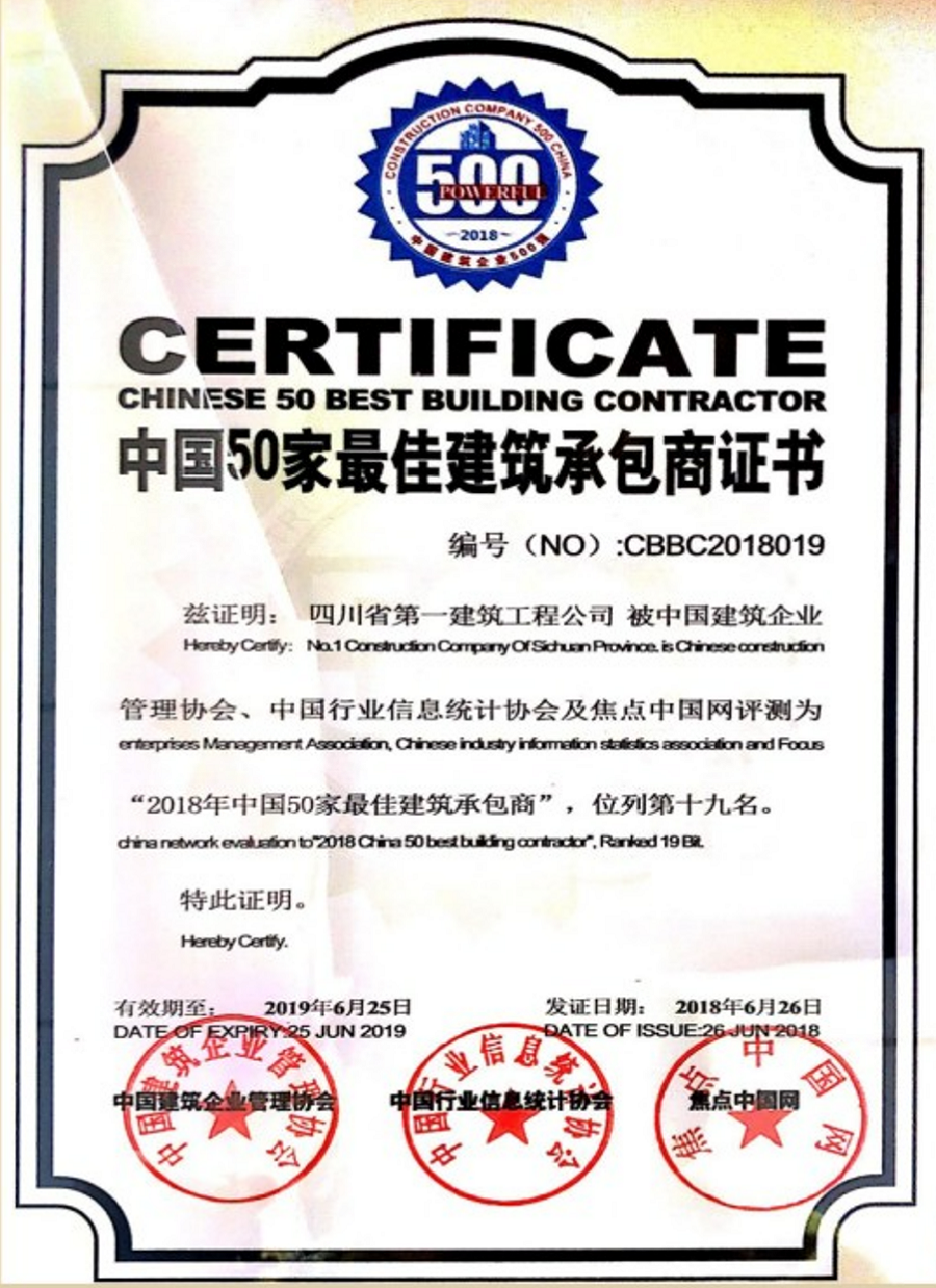 中國50家(jiā)最佳建築承包商證書(shū)
